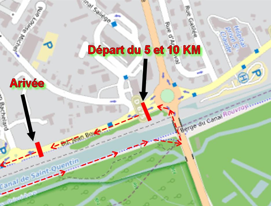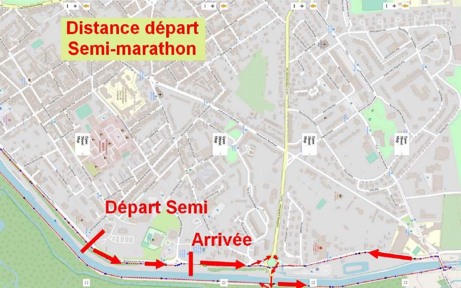 Le départ s’effectue sur le boulevard Jean Bouin en face de l’entrée de parking de la CCI de l’Aisne. Les coureurs effectuent une distance « départ » qui permet d’obtenir les 21,1km officiel. Après le départ, ils se dirigent vers le Rond-point  de la Libération, en le contournant par la gauche, puis il passe sur le pont de Rouvroy pour rejoindre la berge du canal et se retrouve ainsi sur la boucle initiale.