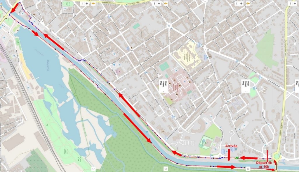 Puis les coureurs du 5 km effectuent une seule fois la boucle mais les  coureurs du 10 km effectuent 2 fois la boucle